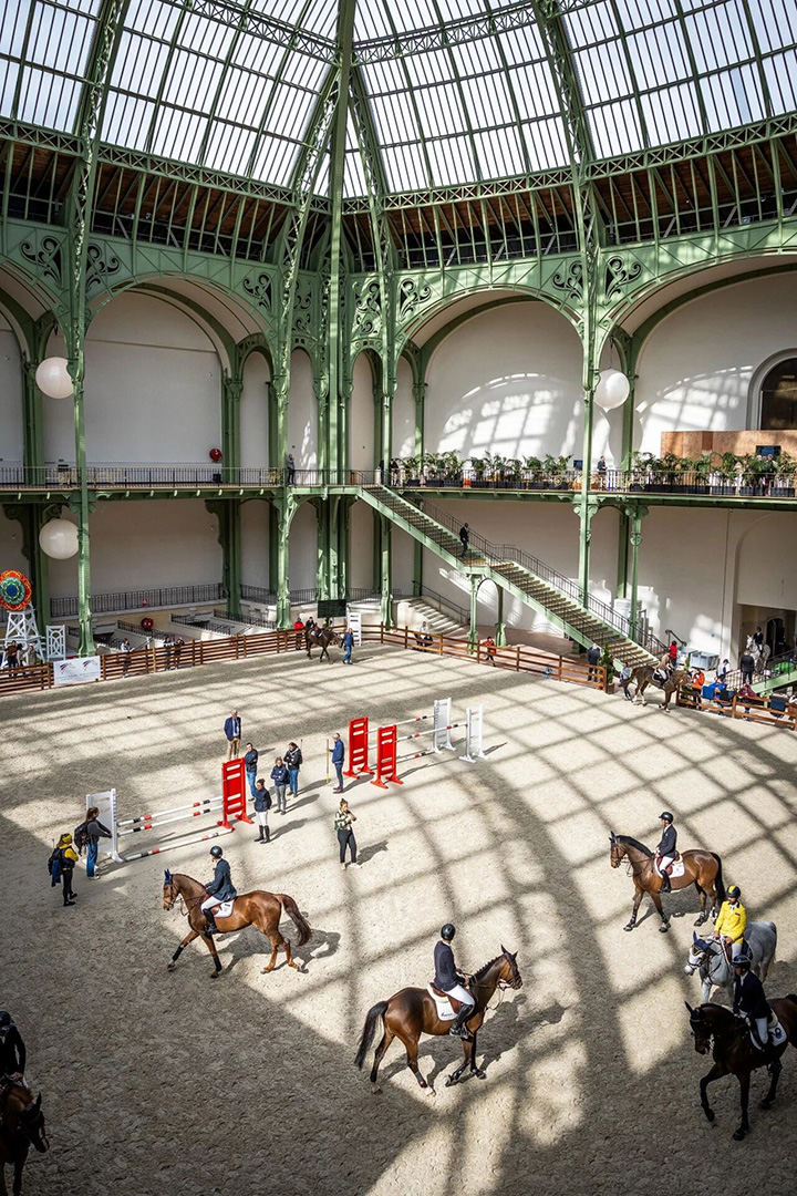 试想巴黎大皇宫化为无垠的障碍赛场。中殿内,沙砾随着光线变化。从看台到步道,地面铺满细沙。围栏、赛道标记与马厩工具划分空间格局,装点回廊。马厩?竟像海滨小屋般别致。