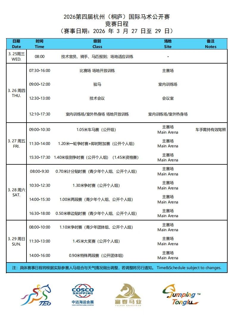 比赛将在3月27日(周五)正式拉开帷幕。当天进行1.05米车马赛(公开组)、公开个人组的1.20米一轮争时赛+即时附加赛及1.40米级别争时赛。