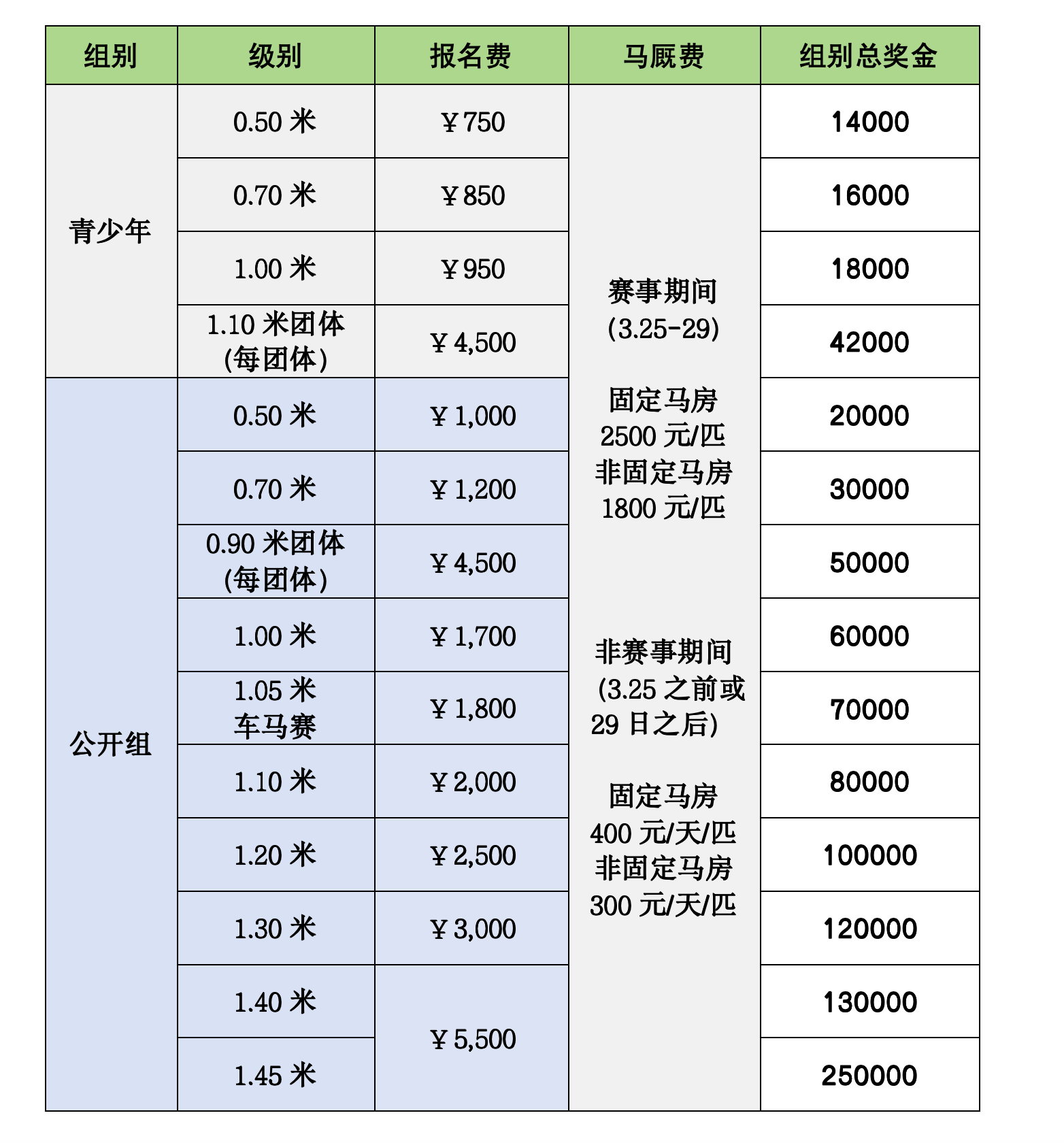- 0.90米、1.10米-1.45米级别:同一马匹在同一级别只能由1名骑手骑乘参赛。