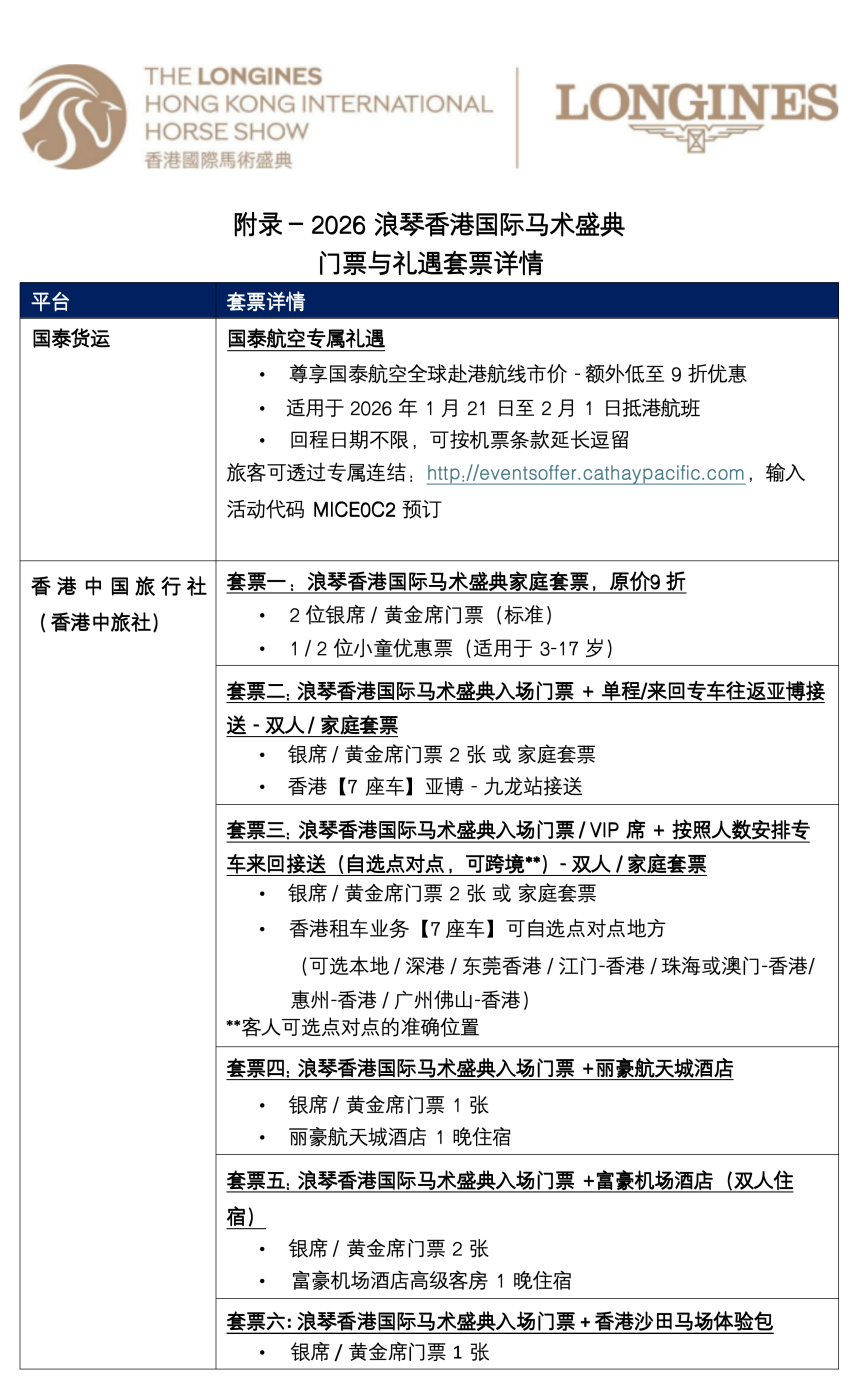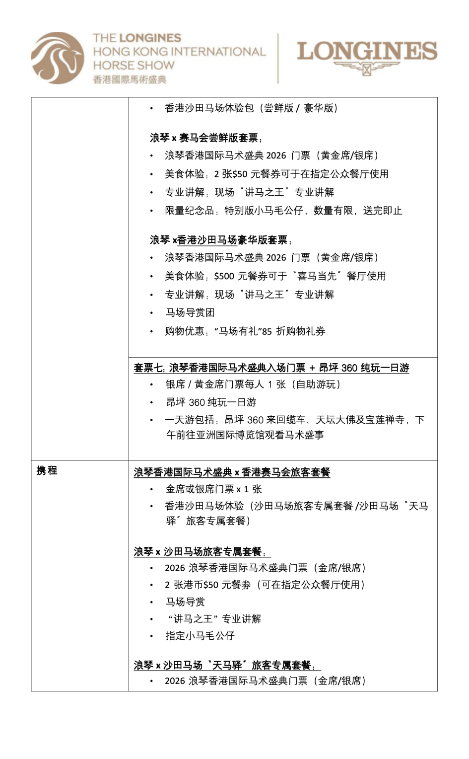 香港赛马会作为战略合作伙伴,专为团体来宾量身打造的“浪琴香港国际马术表演赛 x 香港赛马会体验套票”现已通过香港中旅社及携程发售,并设有尝鲜版及豪华版两种选择。套票包含盛典门票、餐饮礼券及于沙田马场举行的专业赛事现场评述,让各位访客都能在这个标志性场地享受精彩绝伦的一天。