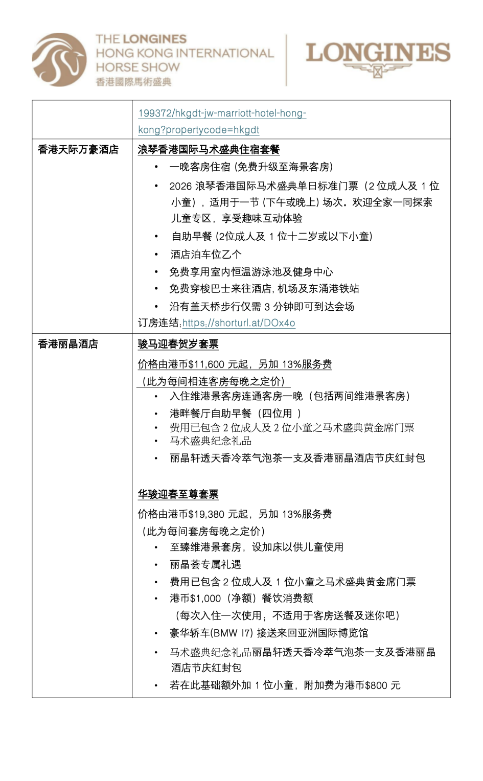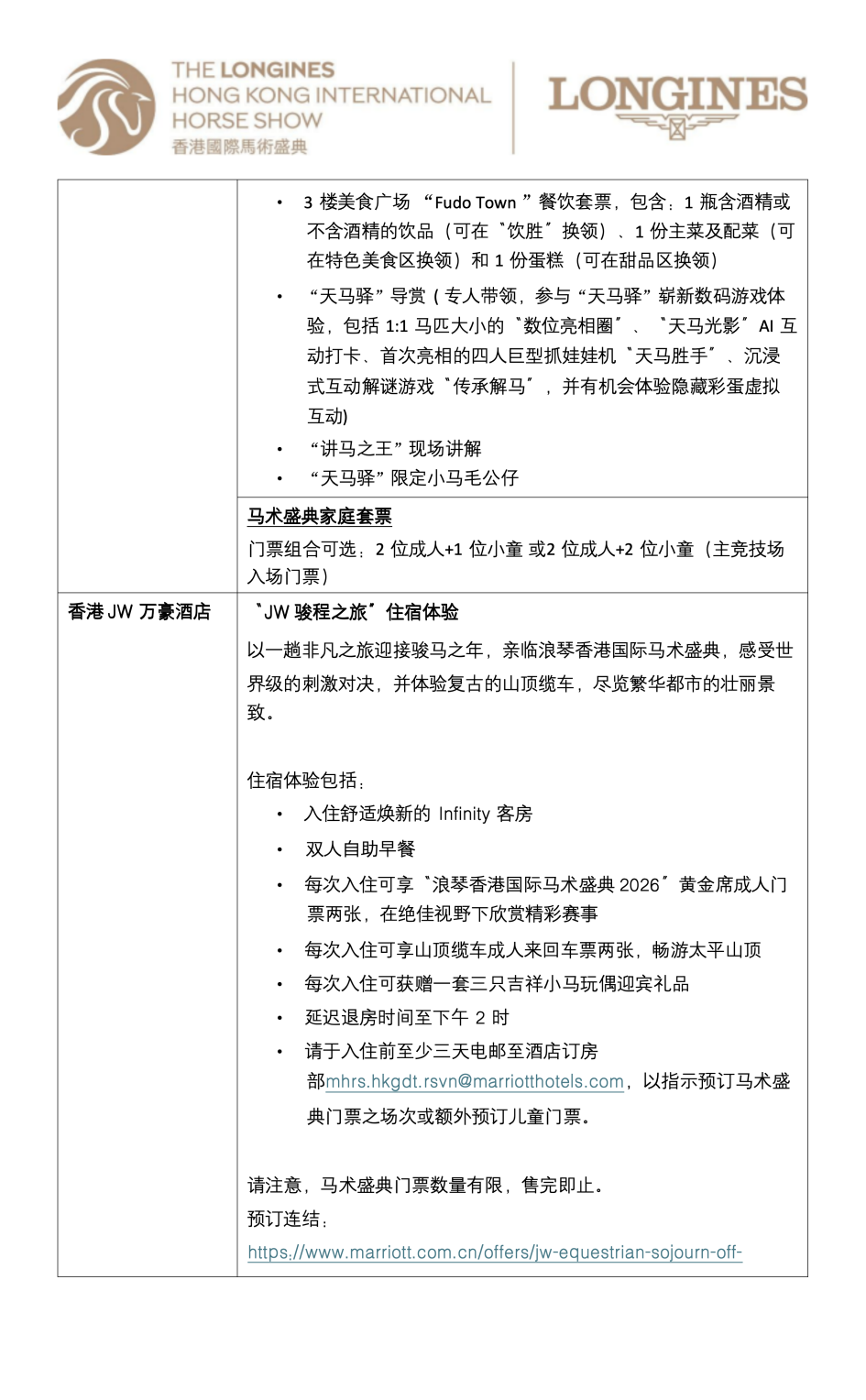 精心设计的门票和专属套票兼具灵活性和格调,旨在满足多元观众的兴趣与偏好——无论是家庭、情侣或朋友团体,无论是首次了解马术的人士、亦或资深马术迷,皆可获得理想体验。门票及套票将透过官方合作伙伴Klook、携程及香港中国旅行社发售;参与合作的知名酒店品牌包括香港 JW 万豪酒店、香港天际万豪酒店及香港丽晶酒店 。
