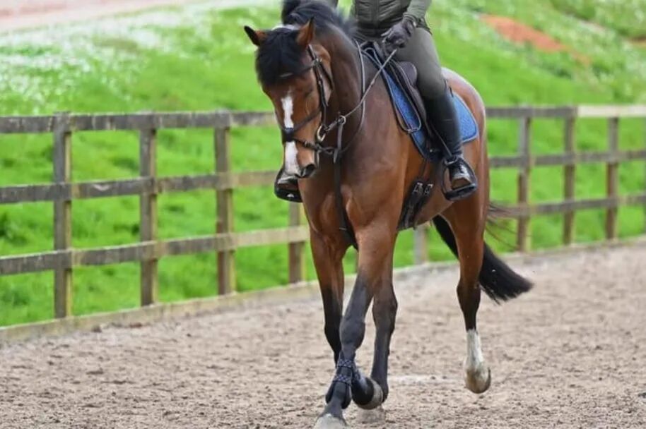 观察马匹外侧肩部(通常是靠近场地围栏的一侧):