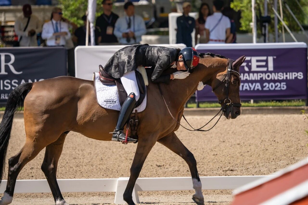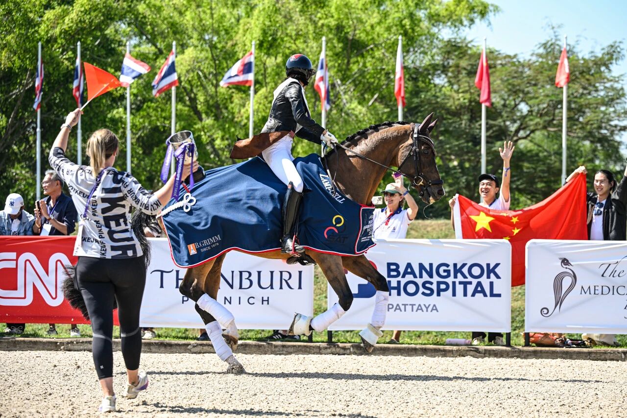 饶嘉怡搭档“木法沙”夺得2025亚锦赛第一中级科目自由演绎项目冠军 图/FEI