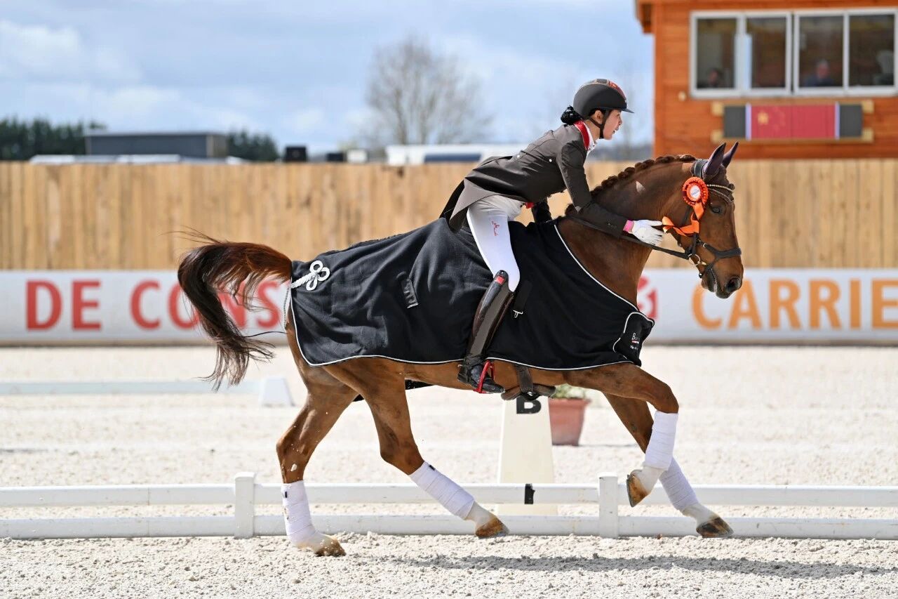 这种能力,在训练中体现得尤为明显。接手几乎不会换腿的搭档“泰迪”后,她从基础开始,一步步建立节奏与理解,最终将它带上第一中级赛场,并在法国拿下第一中级自由演绎冠军。