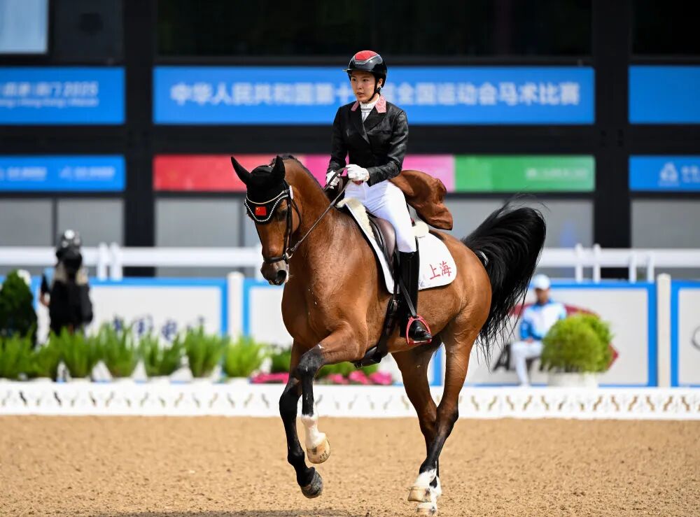 饶嘉怡搭档“藏羚”代表上海队在2025年全运会盛装舞步团体赛中夺得冠军 图/新华社记者 冯开华